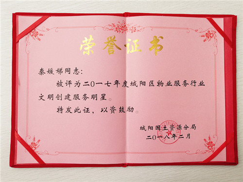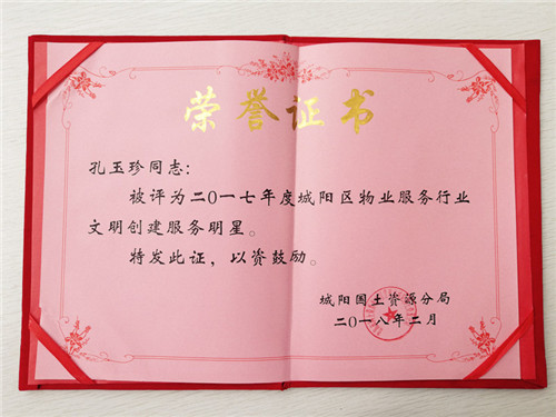 被評為“城陽區物業服務行業文明創建服務明星”