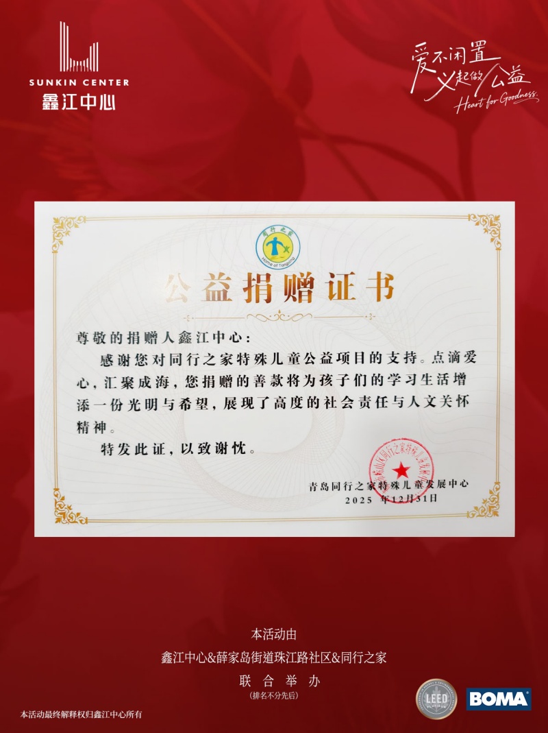 值此歲末年初,此次公益捐贈為鑫江中心的2025年畫上了一個充滿愛心的圓滿句點。2026,新歲已至,我們將繼續攜手各方,推動商業繁榮、向新向善,共建溫暖可持續的商務生態。
